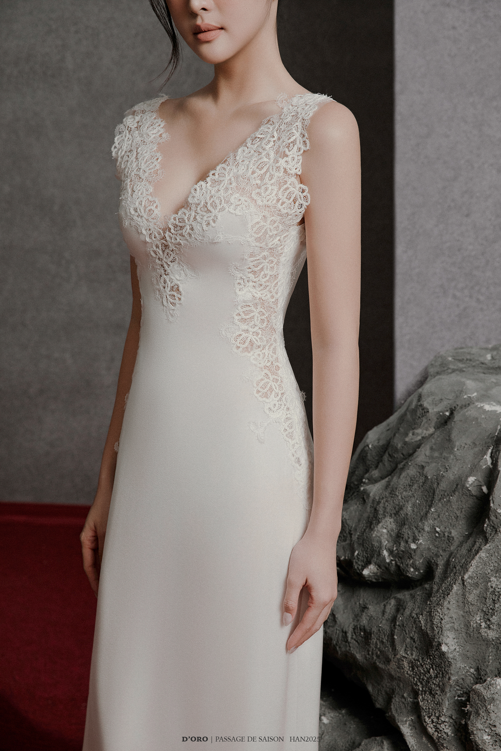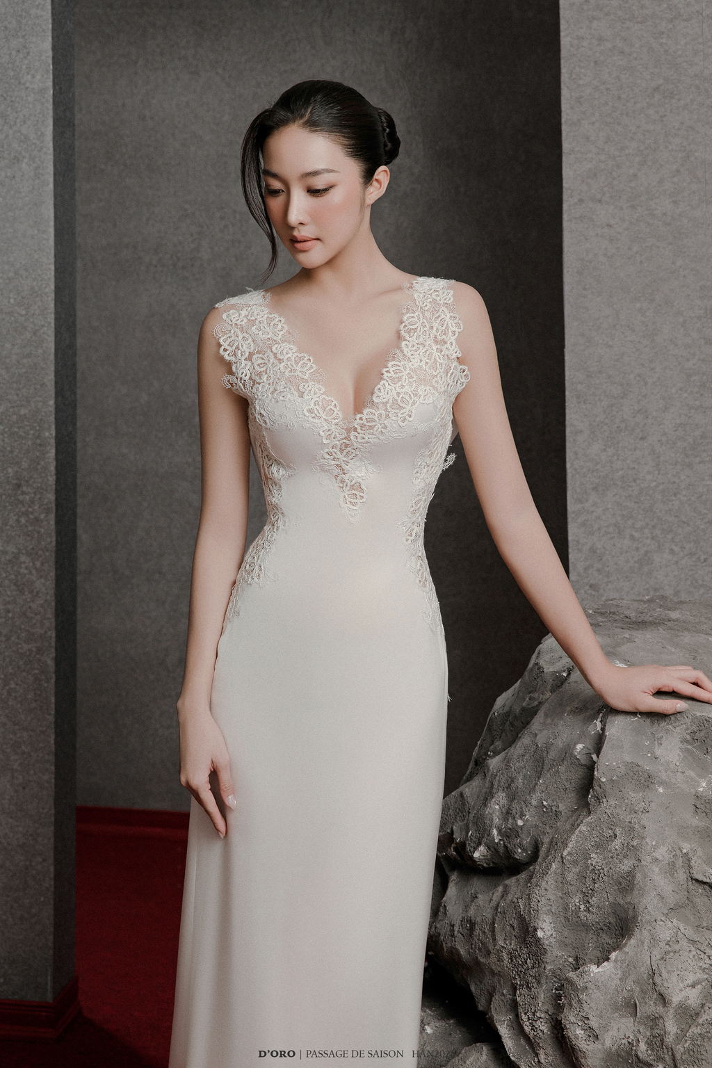 • Hand-stitched embroidered lace.